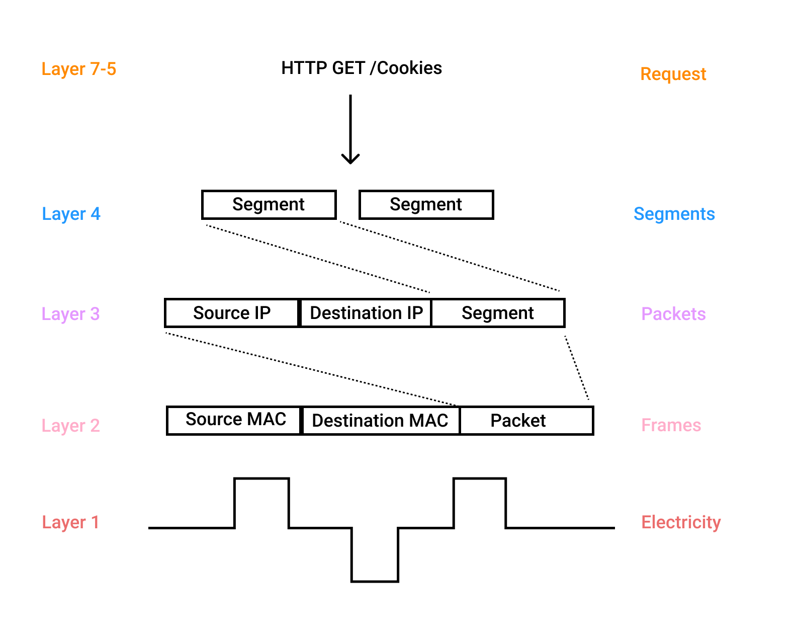 At layer 3, each segment is broken into multiple packets and at this point, the IP addresses are attached, which define what computer on the network (yours or the internet) these packets are destined for.